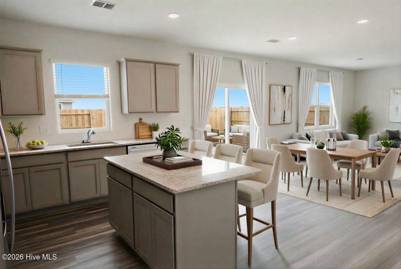 Welcome to Ocean Pointe, a coastal community you're sure to fall in love with! The Rosella floor plan features a spacious open-concept design that effortlessly connects the kitchen, dining, and living areas?ideal for families or those who love to entertain. The modern kitchen includes stainless steel appliances, granite countertops, white cabinets, a large island, and a walk-in pantry, making it both functional and stylish. A flexible first-floor room offers the perfect space for a home office, den, or playroom, and a convenient powder room is located nearby. Upstairs, the generous owner's suite provides a peaceful retreat with a walk-in closet and a private en-suite bathroom complete with dual quartz vanities and a beautifully tiled shower. Three additional carpeted bedrooms share a well-appointed full bathroom, and a spacious central loft offers even more room to relax, work, or play?whether you envision a media area, reading nook, or second office. The home features EVP flooring throughout, and comes move-in ready with a washer, dryer, and window blinds included. Designed for energy efficiency, it also includes a hybrid electric water heater and an upgraded HVAC system. High-speed 1GB Focus Broadband internet is pre-installed and included in your HOA dues. Ocean Pointe offers easy access to beaches, shopping, dining, and the vibrant communities of Wilmington and Southport. Tour our on-site model homes today and discover why the Rosella is the perfect place to call home.